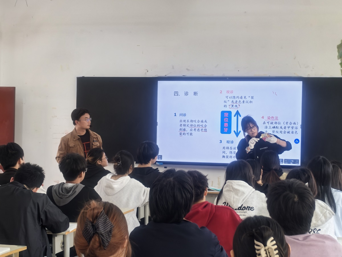 课堂上,陈欢老师围绕牙隐裂这一核心教学内容,从牙隐裂的病因、临床表现、诊断方法到治疗原则,层层递进、逻辑分明地进行讲解,同时结合临床案例分享,帮助学生更好地理解理论知识与临床实践的关联。课堂互动环节,积极引导学生思考,鼓励学生结合预习内容提出疑问,课堂氛围活跃,充分展现了其良好的课堂驾驭能力和专业教学素养。