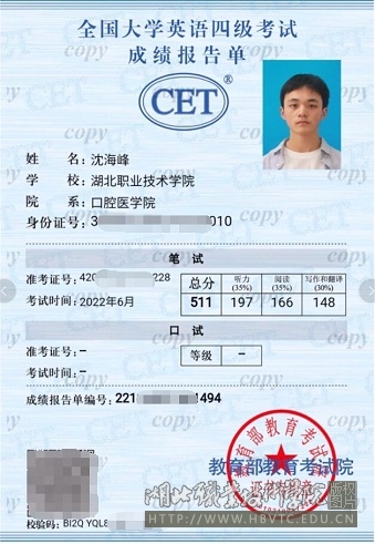 此次大学英语四级考试(CET4),我院共有79人通过,其中2021级学生沈海峰同学考试成绩511分,为湖北职业技术学院最高分。