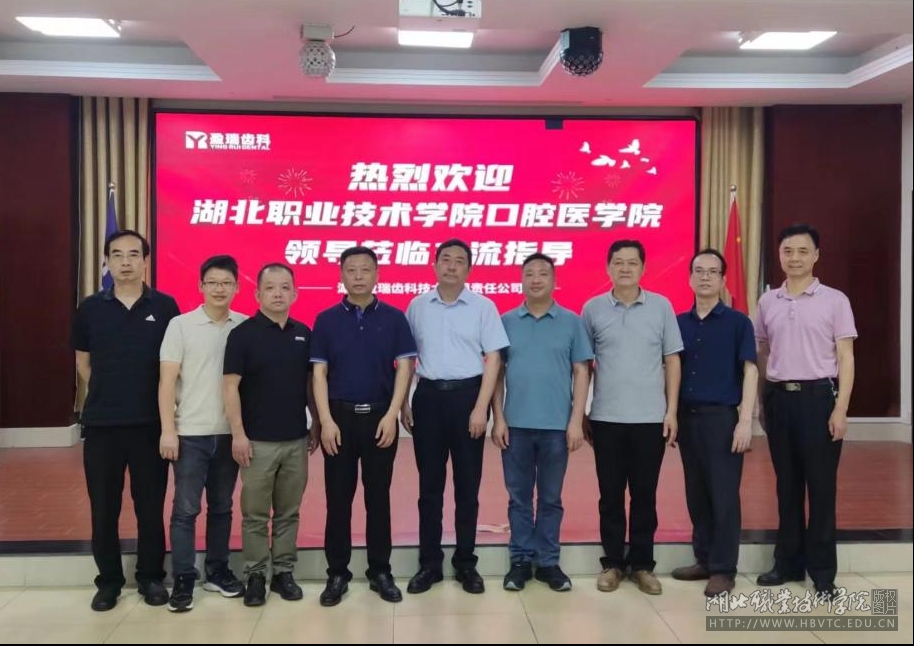 6月8日下午,湖北职业技术学院口腔医学院院长何伟、党总支书记孙国运,副院长肖严、李周胜,教学办主任肖明贵到湖北盈瑞齿科有限责任公司开展访企拓岗活动。湖北盈瑞齿科有限责任公司总经理郑益周、技术部负责人焦灵芝等一行陪同。