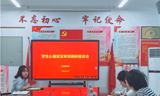 5月27日下午,一场聚焦大学生心理状况的专项调研座谈会在口腔医学院会议室顺利举行。学校党委学生工作部心理中心主任胡敏、心理中心调研组成员、口腔医学院学工副院长张玮、口腔医学院心理专干苏莹及全体辅导员共同参与,旨在深入了解大学生心理状况,探讨有效的心理辅导策略。