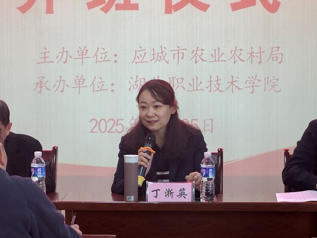 开班仪式上,湖职继教学院丁浙英院长首先致辞。她代表学校对应城市农业农村局长期以来的信任与支持表示感谢,向奋战在农业一线的参训学员致以热烈欢迎。丁院长介绍,学校深耕农业技术培训领域10年,已成功承办数十期相关项目,形成了“政校协同、精准施训”的工作机制、“多元融合、知行并进”的课程体系、“名师引领、专兼结合”的师资团队及“全程管理、暖心服务”的保障模式,此次承办培训既是荣誉更是责任,将全力以赴为学员提供优质教学与服务。