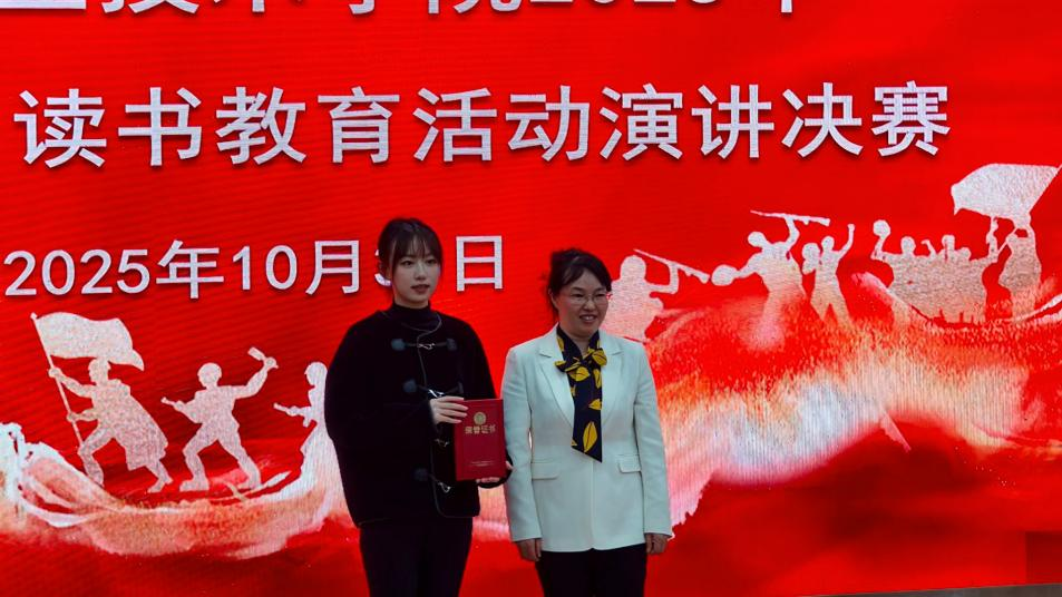 10月30日晚,由校团委、校关工委主办的2025年“中华魂”读书教育活动演讲决赛在西区文博馆报告厅举行。梅运悦老师经过预赛、复赛的层层选拔,成功晋级决赛。在决赛舞台上,她紧扣辅导员工作实际,结合专业特色与青年成长需求,以真挚的情感、生动的案例和富有感染力的表达,赢得了评委与观众的一致好评,最终荣获一等奖。