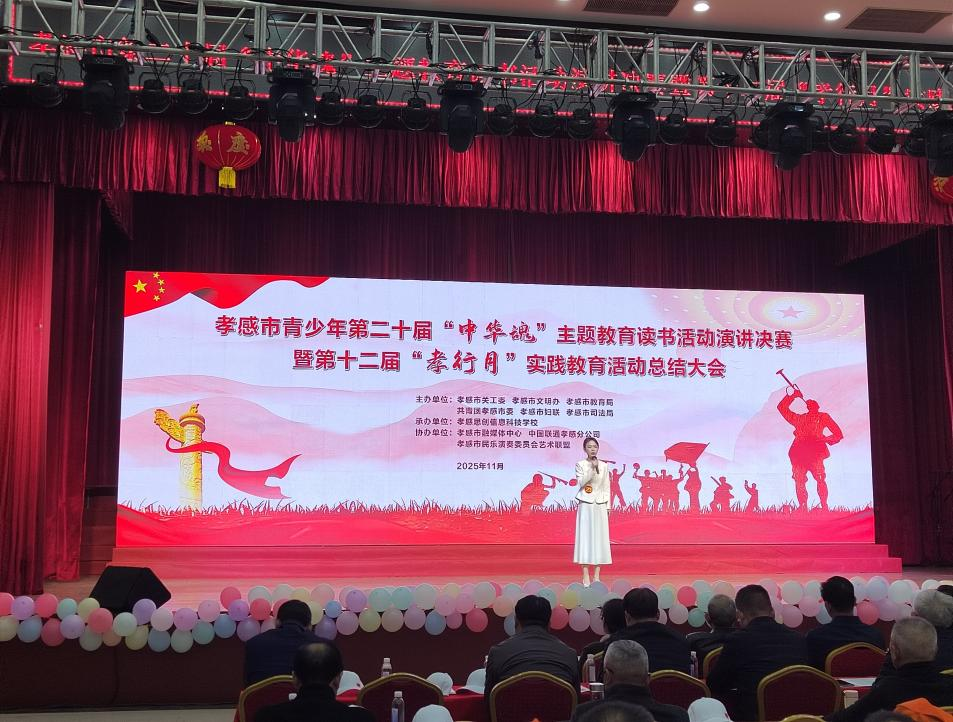 随后,在11月26日举行的孝感市青少年第二十届“中华魂”主题教育读书活动演讲决赛暨第十二届“孝行月”实践教育活动总结大会上,梅运悦老师代表学校参赛,与来自全市的27名选手同台竞技。她以铿锵有力的话语诠释红色信仰,以饱满的热情展现我校师生积极向上的精神风貌,经过激烈角逐,荣获二等奖。