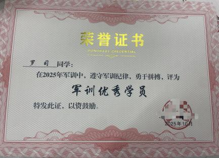 在2025年10月军训期间,她凭借顽强的意志力克服身体疲惫,始终严守纪律,荣获“军训优秀学员”称号。同年12月,她积极参与学校元旦晚会,在节目中饰演“白雪公主”一角。排练阶段,她主动团结同学、携手付出;正式表演时,她全情投入角色,将“白雪公主”的形象演绎得惟妙惟肖,深深打动了现场观众,赢得了大家的喜爱。